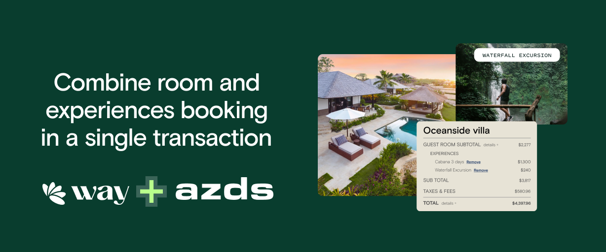 Together, Way and AZDS are excited to announce a new, fully-integrated rooms + experiences reservation journey for hotels and resorts to sell rooms and ancillary experiences in a single booking flow.